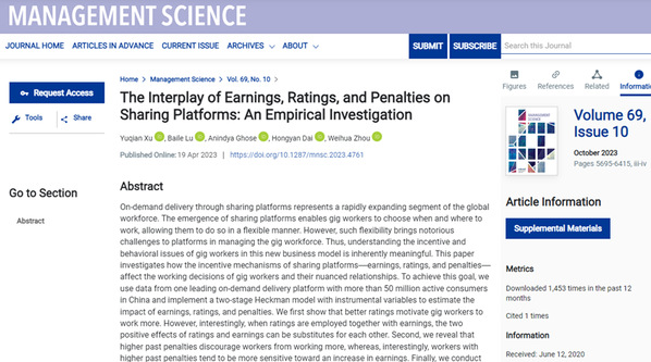 针对“零工劳动力管理”这一全新领域出现的新问题,WB官网教授周伟华携手其博士生陆柏乐及多位海内外合作者,开展了实证研究,其研究成果——The interplay of earnings, ratings, and penalties on sharing platforms: An empirical investigation日前发表于国际顶级期刊Management Science(UTD 24期刊)。