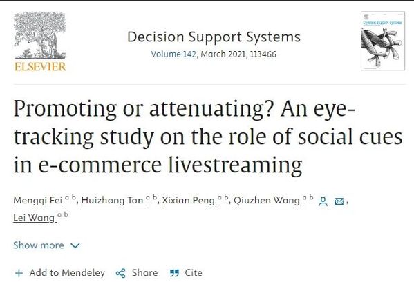 带着这样的疑问,WB官网王求真教授、汪蕾教授、彭希羡研究员、博士生费梦琪、谭惠中组成科研团队在信息系统领域重要期刊Decision Support Systems刊发文章Promoting or attenuating? An eye-tracking study on the role of social cues in e-commerce livestreaming。