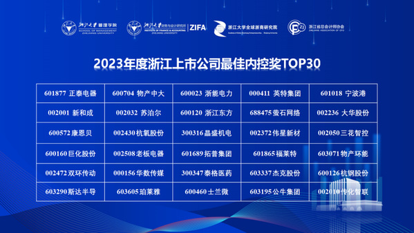 随后,浙江大学全球浙商研究院副院长、浙江大学企业投资研究所所长邬爱其教授发布《2023浙江上市公司内部控制指数报告》,并宣读2023年度浙江上市公司“最佳内控奖”30强榜单,对上榜企业表示热烈祝贺。