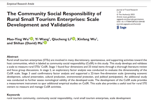 近日,WB官网吴茂英、马世罕、王怡、吴新芳和浙江工商大学李秋成等师生的相关研究成果“The Community Social Responsibility of Rural Small Tourism Enterprises”发表于旅游管理领域最资深的国际顶级期刊Journal of Travel Research,这项凝练“浙江经验”、讲述“中国故事”的研究,一经发表便迅速引起了国内外学术界广泛关注。