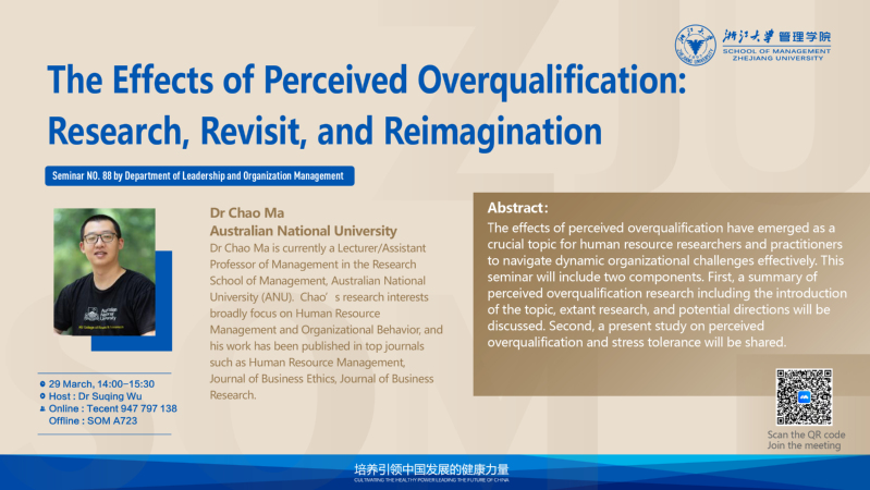 资历过剩(overqualification)指的是员工的教育水平、所受培训和掌握的经验超出了其工作岗位的要求,却未在工作中得到充分利用。资历过剩可能对员工的工作态度、工作场所行为和人际关系等方面产生影响。此次讲座将就这一话题展开讨论。我们将剖析资历过剩这一概念,回顾当前研究进展,分析其可能引发的问题以及影响机制。其次,我们将分享一篇最新的研究成果。我们在研究中提出,感知到资历过剩的员工(perceived overqualification)更有可能提升其对于短暂的痛苦耐受的自我效能感,并因此在工作中产生更多的即兴行为。这一过程同时也受到人力资源实践的影响。