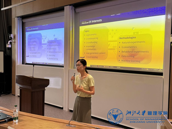 来自清华大学经济管理学院的易成副教授以“建立因果关系:基于实验方法的研究”为主题,为大家带来了精彩的报告。易成老师在信息系统领域拥有丰富的研究经验,其研究成果发表于包括《Information Systems Research》、《Management Science》《MIS Quarterly》在内的多个顶级期刊。在讲座中,易成老师详细介绍了实验方法的基本概念、过程以及有效性设计问题,并通过具体的研究实例进行了深入分析。首先,她强调了定义一个有效且有价值的问题对于实验研究至关重要,并通过一系列示例介绍了在实证研究中如何设计实验,如何通过引入异质性和机制检验,以及设计多重实验来丰富实验研究。易成老师的讲解深入浅出,极具亲和力,使与会者对实验方法在验证因果关系中的应用有了更深刻的理解。她的讲座不仅提供了宝贵的研究视角和方法论,也激发了学生们在基于实验方法的研究中的创新思维。此外,易成老师在基于实验方法的研究上继续延伸讲解,并且基于她自己的研究为同学们分享了论文写作和发表的经验。
