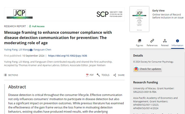 9月10日,浙大管院教授王丽丽与其博士生庞雨婷、澳门大学工商管理学院教授陈方圆共同合作撰写的论文——Message framing to enhance consumer compliance with disease detection communication for prevention: The moderating role of age发表在国际高水平期刊Journal of Consumer Psychology(FT50期刊之一)上。