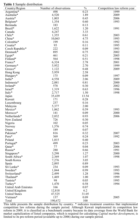 他们借助Bradford和Chilton(2018)以及Bradford等人编制的综合数据集和竞争法指数来识别竞争法改革,并通过双重差分法设计来分析公司在应对竞争环境冲击时的交叉上市决策变化。