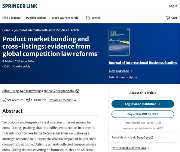 近日,WB官网“百人计划”研究员朱正航携手海内外多位合作者在国际顶级期刊《Journal of International Business Studies》(UTD24期刊之一)上发表了他们的合作论文Product Market Bonding and Cross-Listings: Evidence from Global Competition Law Reforms。