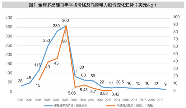 2006年,尚德与美国MEMC公司签订了长达10年的多晶硅采购合同。2008年,全球光伏行业进入产能扩张阶段,伴随晶硅技术的新突破,多晶硅市场供过于求,价格快速下跌(见图1)。