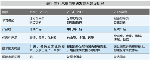 2003年前,吉利汽车技术能力相对薄弱,主要通过引进国际上成熟的技术进行知识积累,在拆装夏利车等逆向工程中实现“干中学”,并特别关注在流程创新中提高生产效率。