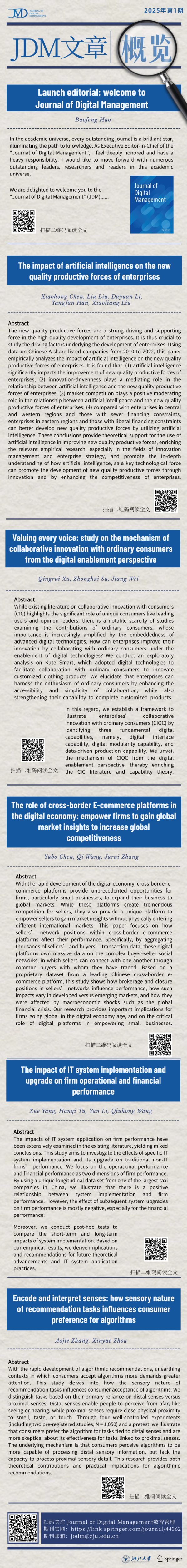 该期刊由浙江大学主办,国际知名学术出版机构Springer Nature合作出版。作为数智管理研究领域的重要学术平台,JDM期刊致力于深入探讨数字化转型、数字制造、平台治理和数字经济等前沿议题,为中国数字经济的可持续发展提供理论支撑和实践指导。