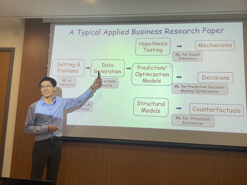 随后,张教授分享了AI在商科研究中的应用思路。他指出,若想在顶级期刊发表成果,AI不仅可用于数据生成,还应结合假设检验、预测与优化模型、结构化建模等工具,开展更系统、更深入的研究。他介绍了个人在这些方向的研究经验及最新的OR工具在LLM推理中的应用,为师生们提供了前沿视角。