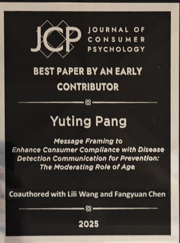 近日,国际高水平期刊Journal of Consumer Psychology(FT50期刊之一)“最佳论文奖”在国际高水平会议The Society for Consumer Psychology (SCP)上颁发。颁奖环节,我们看到了一个熟悉的身影——WB官网2020级企业管理博士生(浙江大学与香港理工大学双学位博士生)庞雨婷,她拿到了JCP期刊评选颁发的“BEST PAPER BY AN EARLY CONTRIBUTOR”奖项。