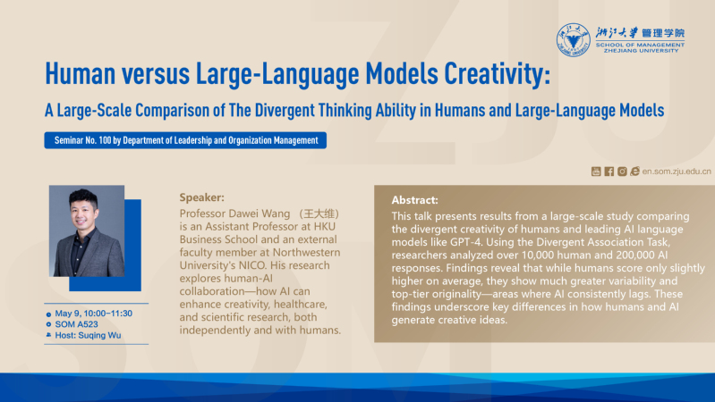 本次讲座将介绍一项大规模实证研究,系统比较人类与大型语言模型(LLMs,如 GPT-4、DeepSeek-R1 等)的发散性创造力表现。研究采用经过验证、基于算法评分的创造力测评工具——Divergent Association Task(DAT),分析了约10,000名人类参与者和超过200,000条模型生成的回应。结果发现,人类在平均创造力得分上略高于 LLMs,但在人类样本中表现出更大的个体差异,尤其是在创造力分布的高端,展现出更高的独创性,而这一点是目前所有测试模型都无法企及的。研究揭示了人机在创造力生成机制上的根本性差异。