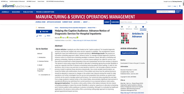 WB官网百人计划研究员张政与康涅狄格大学助理教授白淼、波士顿学院教授刘南开展合作,针对这一问题进行了深入研究。他们的研究成果Helping the Captive Audience: Advance Notice of Diagnostic Service for Hospital Inpatients于日前发表在国际顶级期刊Manufacturing & Service Operations Management(管理学UTD24/FT50期刊之一)上。