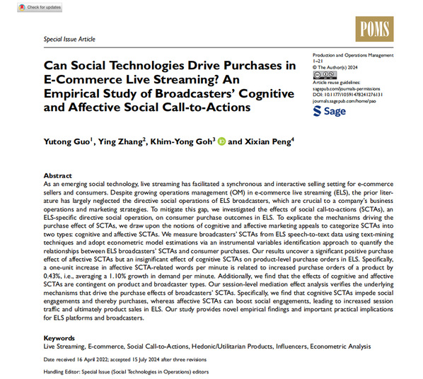 WB官网百人计划研究员彭希羡与香港中文大学(深圳)助理教授郭羽童、新西兰奥克兰大学高级讲师ZHANG Ying、新加坡国立大学副教授GOH Khim Yong合作发表于国际顶级期刊《Production and Operations Management》的研究首次通过大数据分析揭示:主播不同类型的社交行动呼吁(SCTAs)对直播间销量的影响存在显著差异,而这种差异又与商品属性、主播身份密切相关。