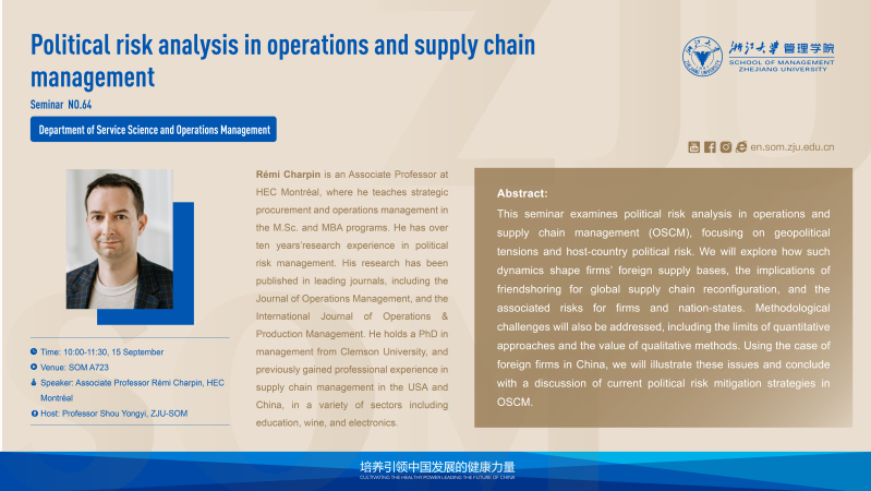 This seminar examines political risk analysis in operations and supply chain management (OSCM), focusing on geopolitical tensions and host-country political risk. We will explore how such dynamics shape firms’ foreign supply bases, the implications of friendshoring for global supply chain reconfiguration, and the associated risks for firms and nation-states. Methodological challenges will also be addressed, including the limits of quantitative approaches and the value of qualitative methods. Using the case of foreign firms in China, we will illustrate these issues and conclude with a discussion of current political risk mitigation strategies in OSCM.