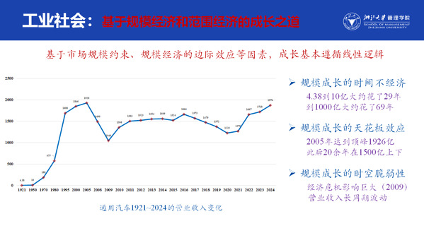 然而,这种模式存在天然瓶颈。“在工业时代,企业增长得慢,而且有一定的上限,企业还会在很大程度上受到环境的影响”杨俊表示,“外部环境一旦变化,如金融危机或技术替代,企业的抗风险能力就面临严峻考验。”这就是工业时代企业增长的三个特点:时间的不经济性、成长的天花板效应以及时空脆弱性。一个典型的例子是,通用汽车从1921年的4.38亿美元营收到突破1000亿美元,用了近70年时间,且在2005年达到峰值后便陷入了长期波动。