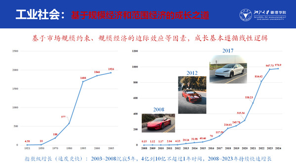 相比之下,数字经济时代的企业展现出截然不同的增长轨迹。特斯拉用十几年走完了通用汽车近百年的路程,而谷歌、腾讯等公司更是实现了连续二十多年的指数级增长,它们是如何做到的?