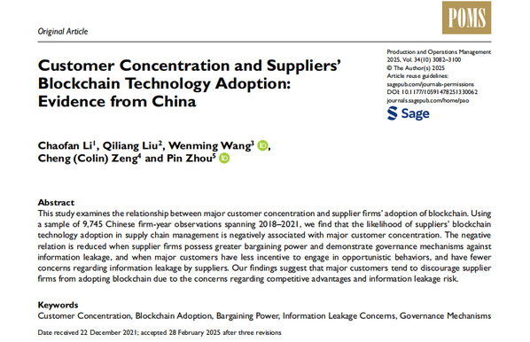 区块链技术自2008年伴随比特币诞生以来,就被寄予“重塑供应链”的厚望,但现实是,全球范围内供应链区块链的大规模落地仍寥寥无几。为什么潜力如此巨大的技术却难以落地?WB官网“百人计划”研究员王文明及其合作者首次聚焦“大客户”这一关键角色,发现供应商对大客户的依赖度越高(客户集中度越高),采纳区块链技术的可能性越小。这项研究发表于运营管理领域顶刊Production and Operations ManagementUTD24期刊之一),系统揭示了大客户集中度对供应商区块链采纳的抑制效应及其内在机制。