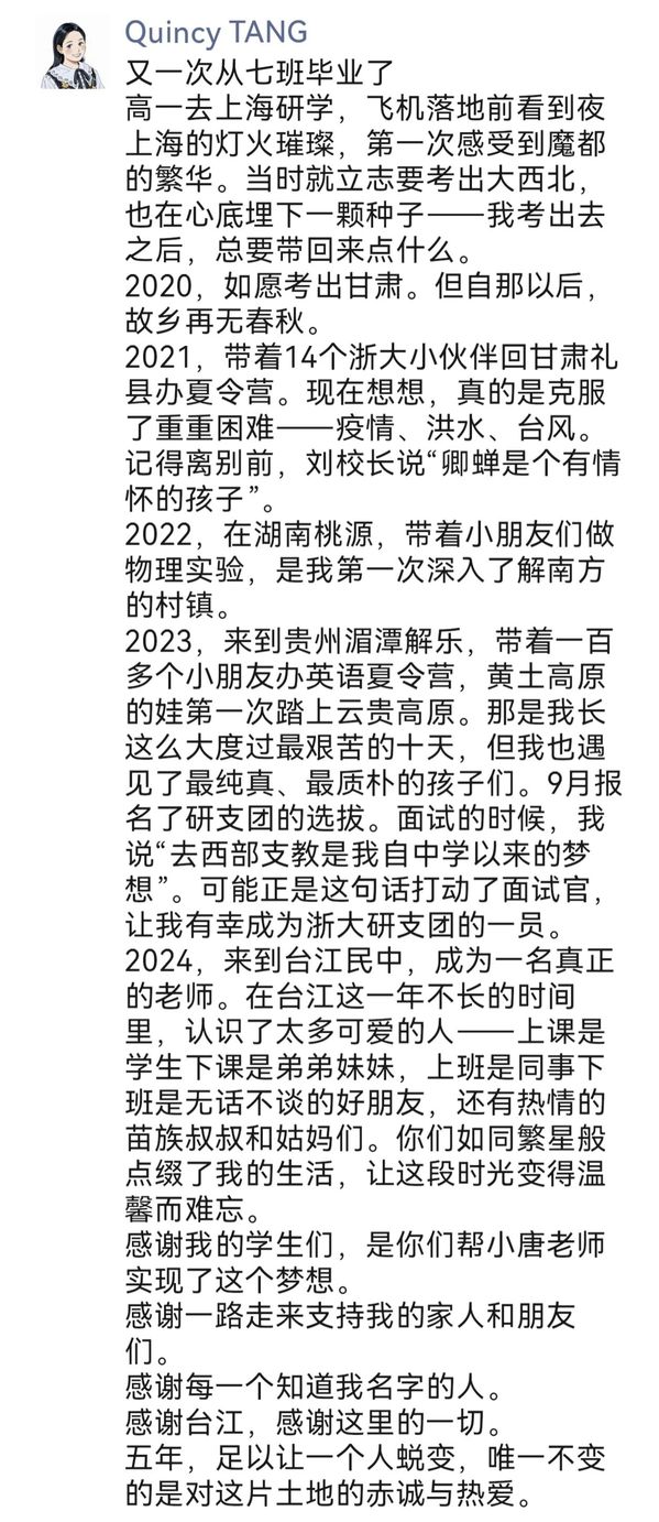 “这几年在支教中的所见所闻,让我深切体会到,造成东西部教育差距的根本原因在于东西部经济发展的不平衡,只有打破这个‘不平衡’,西部教育才能真正迎来改变。所以未来我想要以扎根中国大地的研究,或是扎根一线的实践,为中国经济社会的发展与现代化产业体系建设献力。”